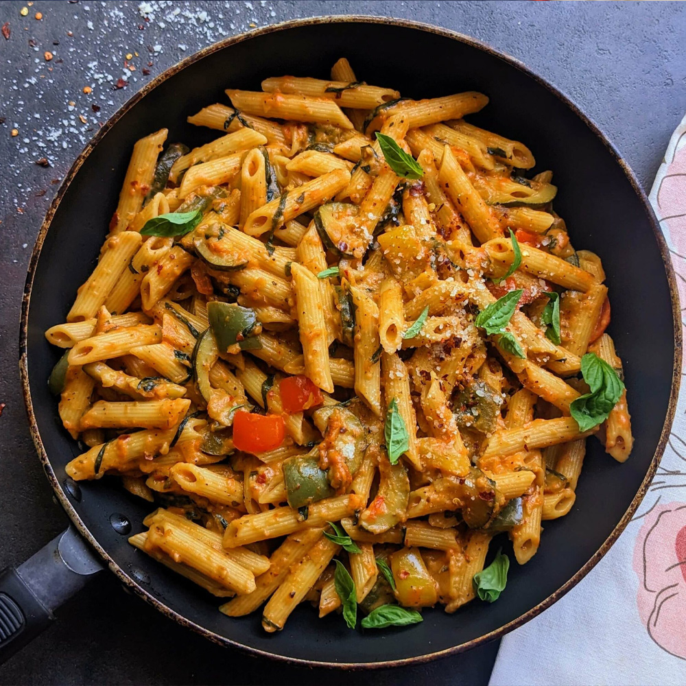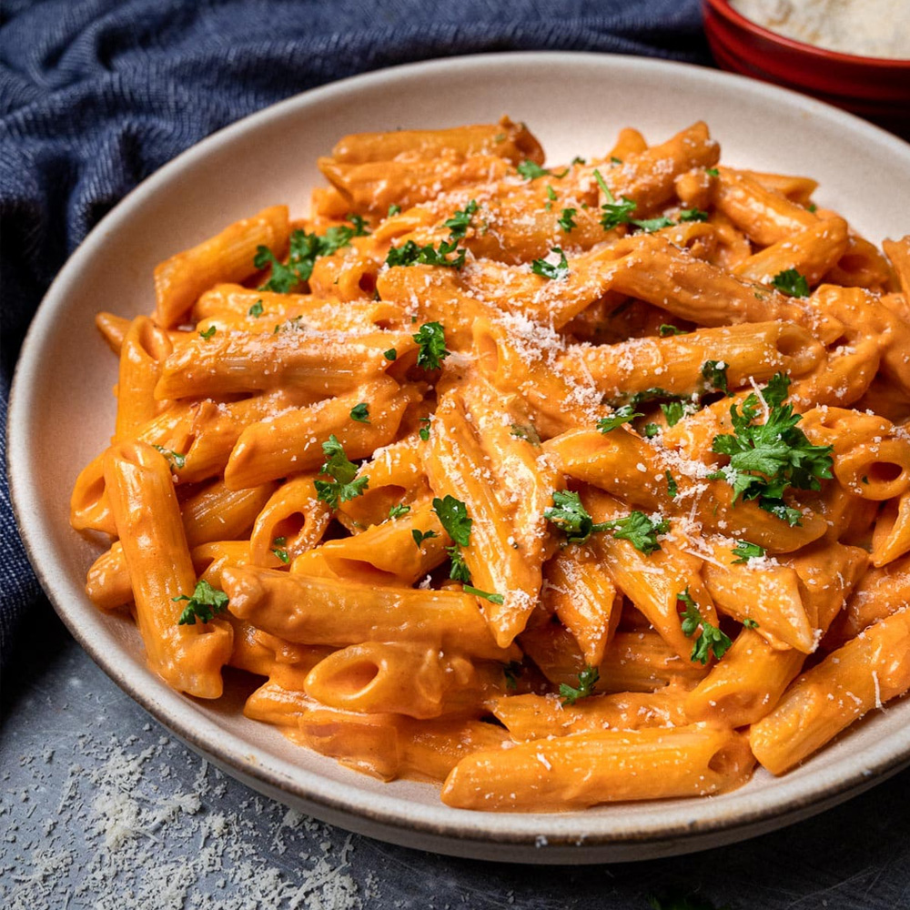 ۱۵۰ گرم پاستا پنه، ۱۵۰ گرم سینه مرغ تکه ای، قارچ، سس آلفردو، پنیر پارمسان