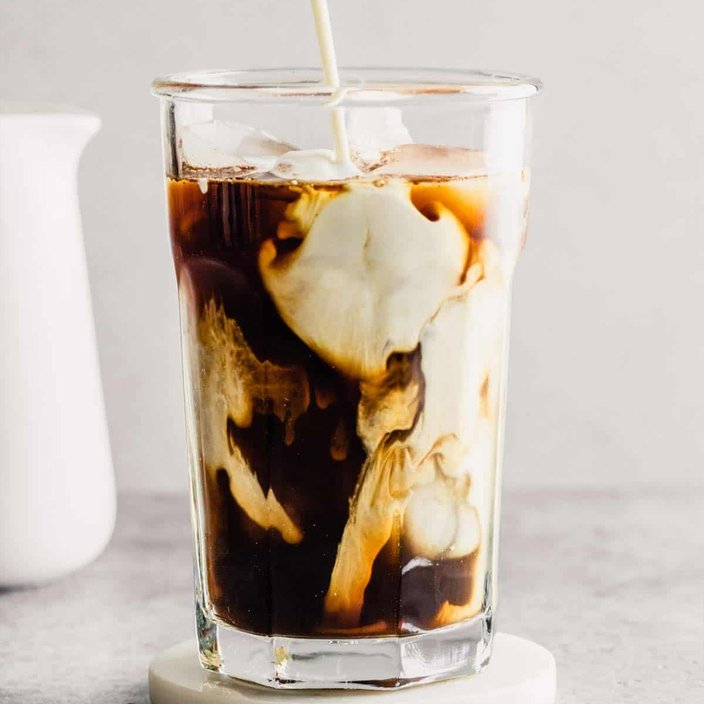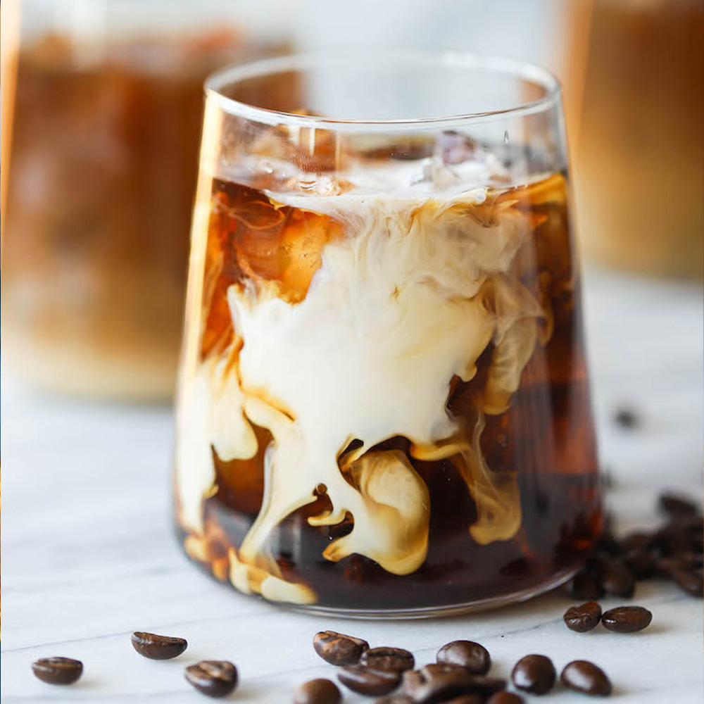 ۳۰۰ میلی لیتر، یک شات اسپرسو ۸۰% عربیکا و ۲۰% روبوستا، شیر، سیروپ کارامل، یخ