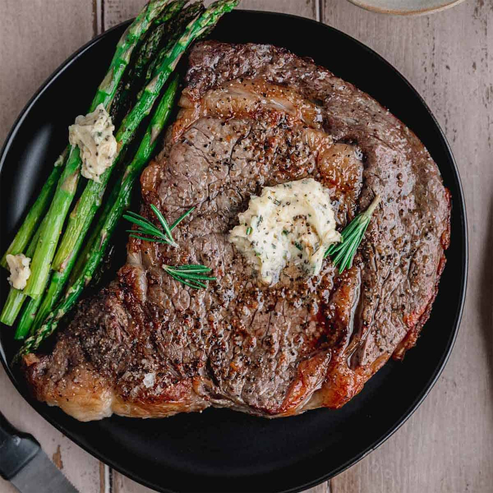 ۳۵۰ گرم استیک راسته گوساله همراه بابافت چربی بدون استخوان، قارچ سوخاری، بروکلی بلانچ، گوجه چری، گارنیش پوره لبو، نان کشاورز، میکرو گرین، سس قارچ، پودر پنیر پارمسان، پیاز حلقهای